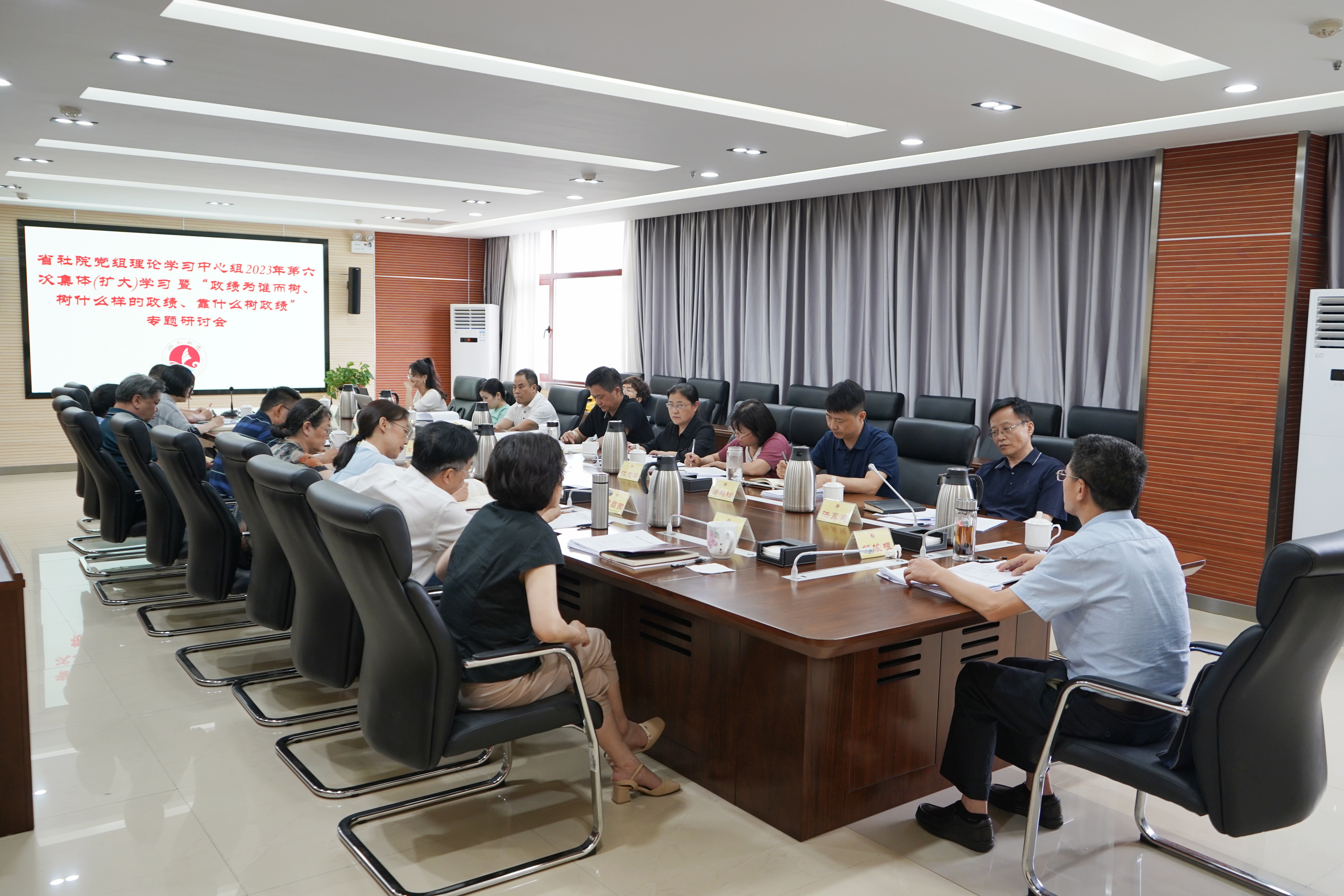 6月20日下午,省社院举行党组理论学习中心组2023年第六次集体(扩大)学习暨“政绩为谁而树、树什么样的政绩、靠什么树政绩”专题研讨。省委统战部副部长、院党组书记符俊根主持会议并讲话,中心组成员、处室负责人、副处长、一级调研员和副高以上教师参加学习。